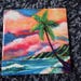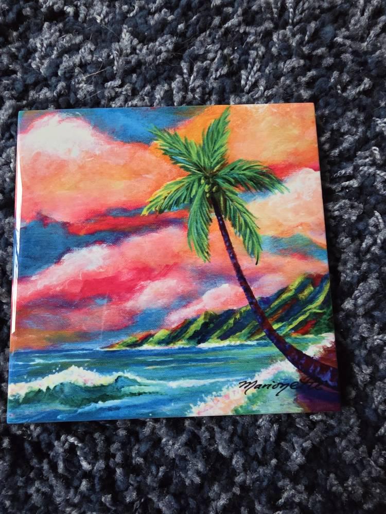 Tropical Na Pali Coast Hawaiian ceramic tile will surely be a happy addition to your tropical decor. It is available in two sizes, 6"x6" and 8"x8". It can be used as as a trivet, displayed on an easel or hung on a wall. It has a cork backing to protect your furniture and a hook for hanging. Colors may vary slightly from monitor to monitor.
