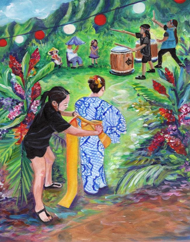 Softened by the late afternoon sunlight on Kauaʻi, two women share a special legacy of a beautiful yukata, its fabric a tapestry of generations which honors the great grandmother who once wore it. As the final folds are adjusted, she feels the weight of the past woven into the fabric and an excitement for the Bon Dance which will connect her to her ancestors. In the distance a vibrant scene unfolds as a cluster of young taiko drummers of a new generation are pounding a rhythmic, ancient call beneath the glowing canopy of red and white paper lanterns. Let the dance begin!