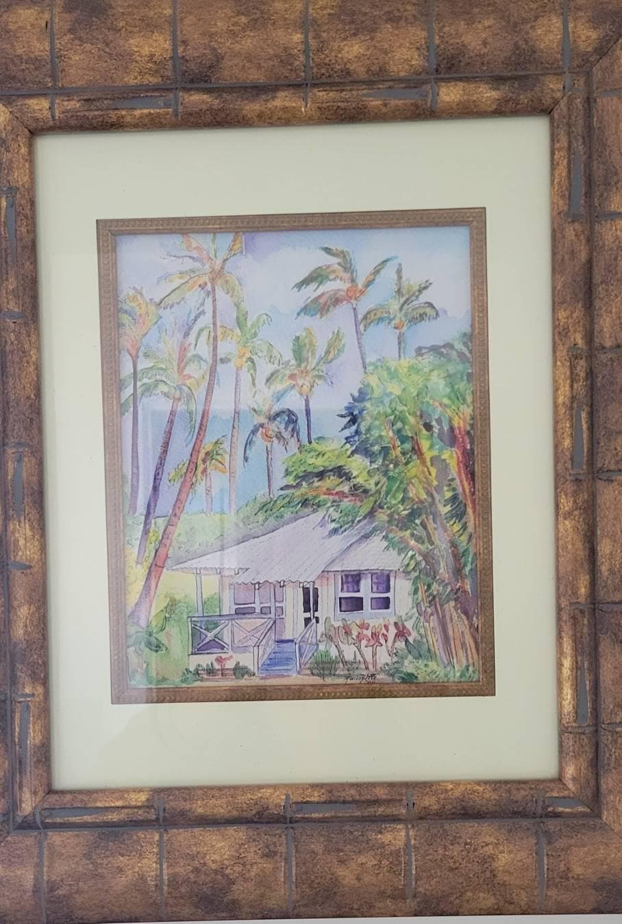 "Tropical Waimea Cottage" - This giclee print is signed by the artist and is printed with archival inks on radiant white watercolor paper. It is a reproduction of an original watercolor painting and comes packed in a clear sleeve with a backing board (unframed). Colors may vary slightly from monitor to monitor.